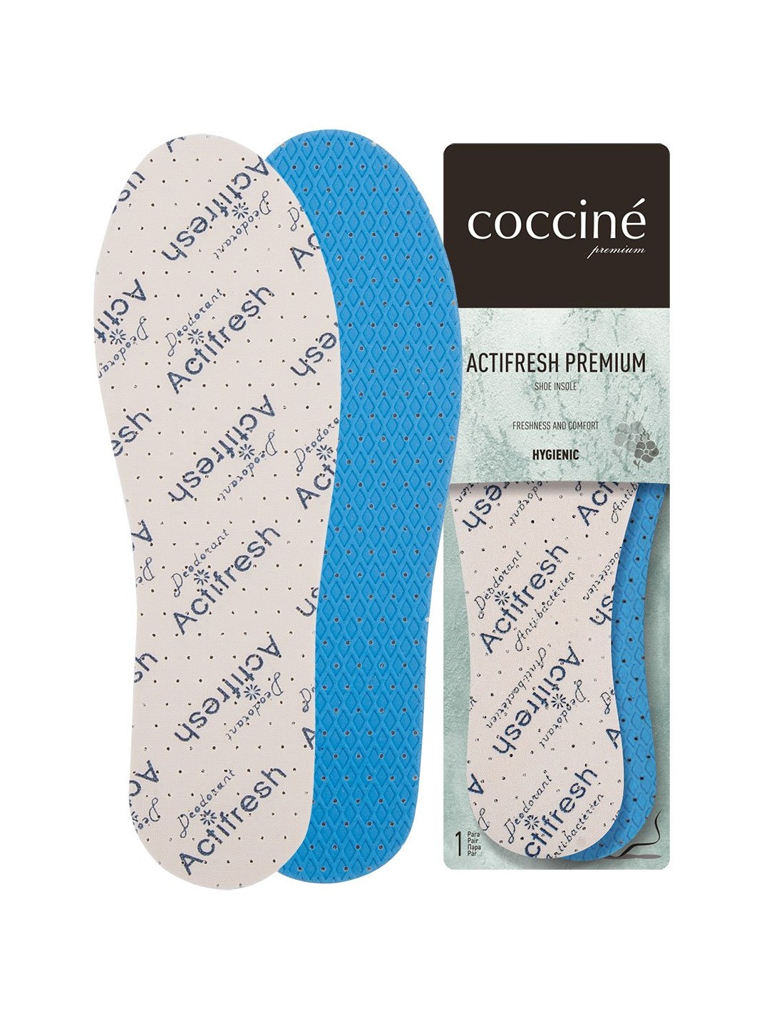 Wkładka antybakteryjna o świeżym zapachu składająca się z trzech warstw: bawełnianej tkaniny wierzchniej, pianki lateksowej ze środkiem przeciwbakteryjnym zapobiegającym rozwojowi drobnoustrojów w wilgotnym i ciepłym środowisku buta oraz przeciwpoślizgowej pianki lateksowej, z fakturą rombów. Perforacja zapewnia cyrkulację powietrza, która daje poczucie komfortu.