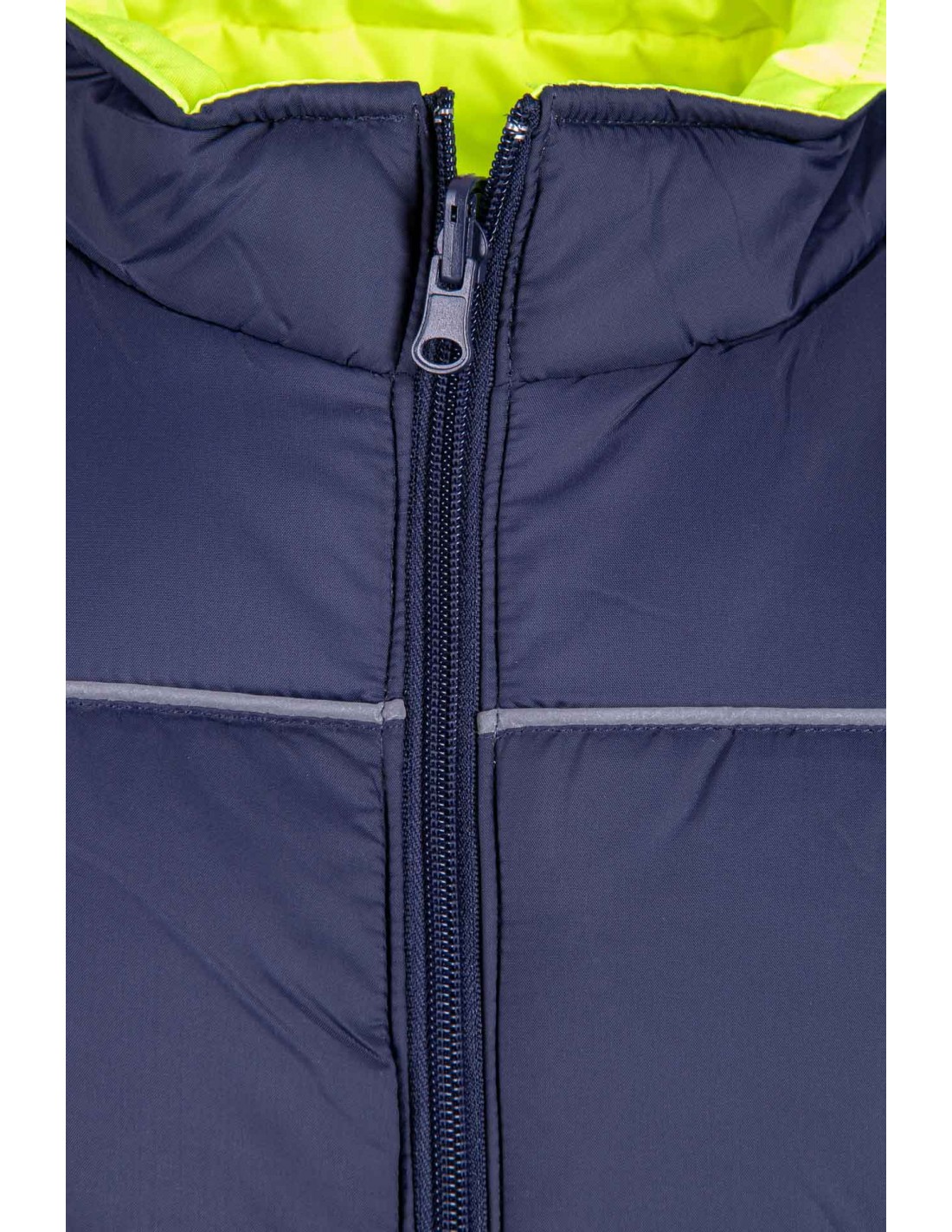 KIESZENIE: na stronie jaskrawej dwie kieszenie zapinane na zamek, zakryte listwą, na stronie granatowej dwie kieszenie boczne, zakończone patką z lamówką,