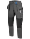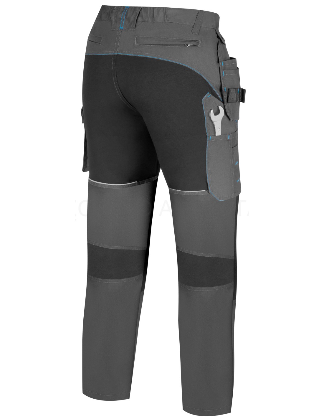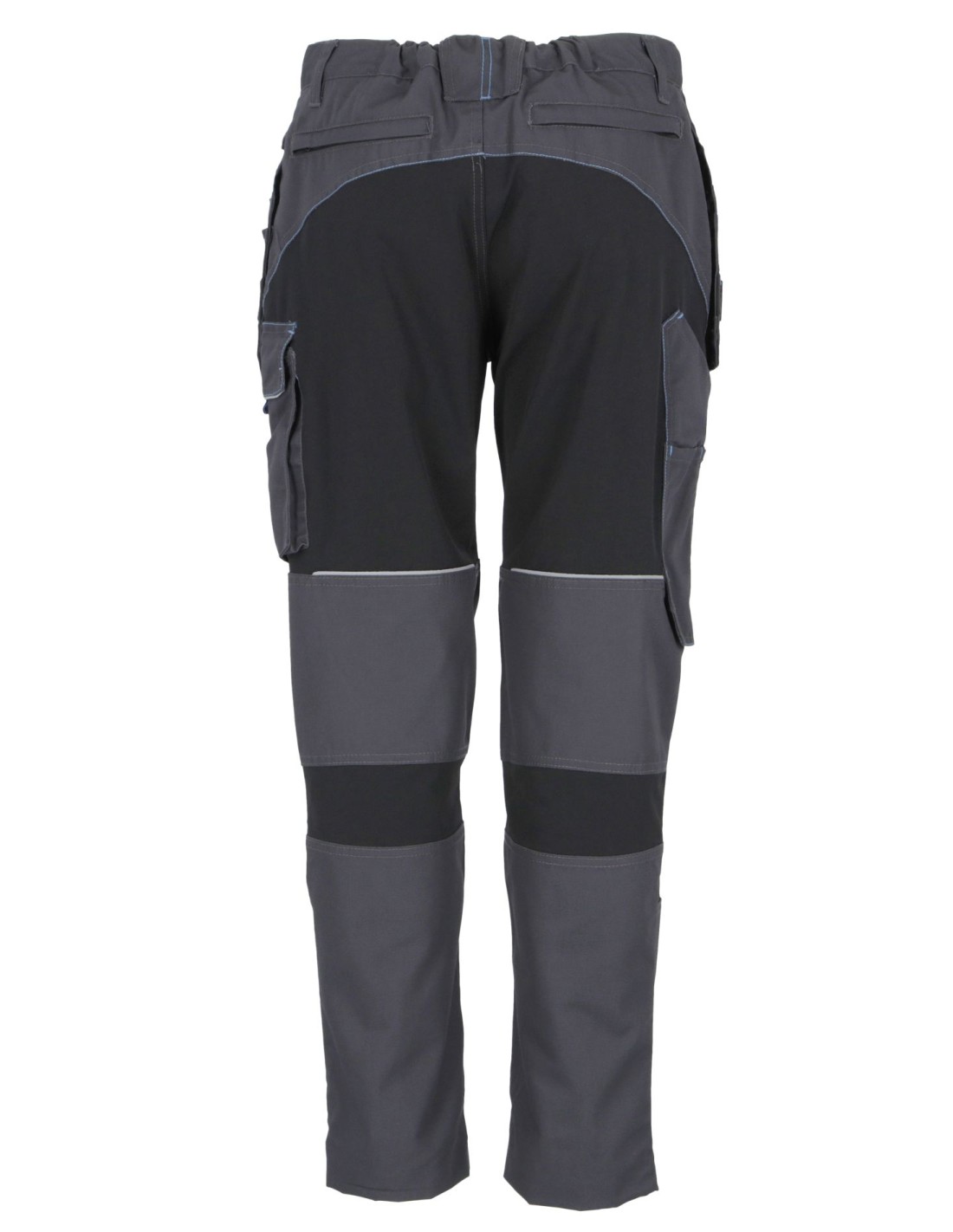 - spodnie robocze-ochronne w kolorze stalowo-czarnym niebrudzącym wraz z estetycznymi niebieskimi wstawkami i przeszyciami, oraz lamówkami odblaskowymi