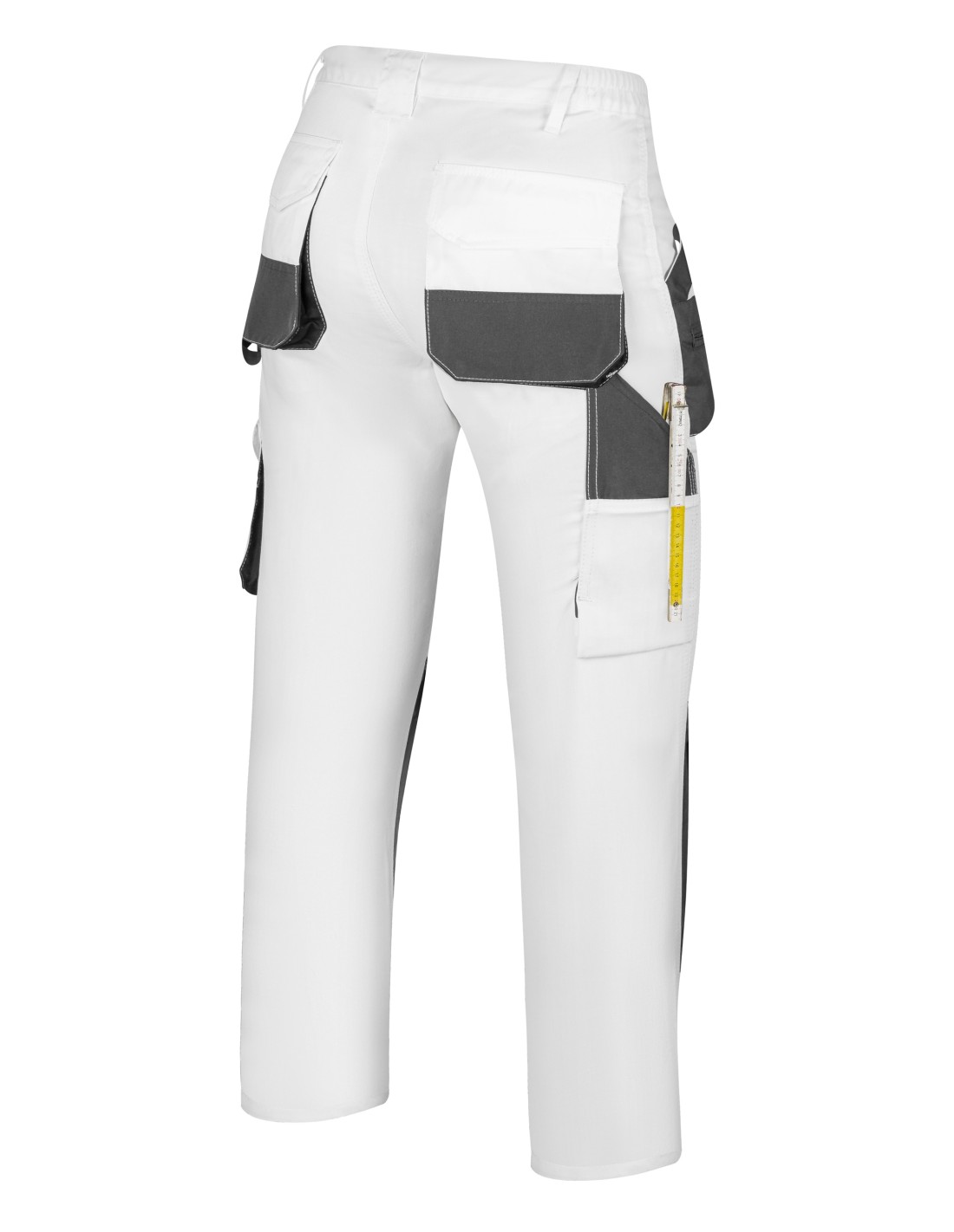 - Spodnie robocze-ochronne w kolorze białym, wraz z estetycznymi stalowymi wstawkami w kieszeniach przestrzennych. Rozporek na zamek błyskawiczny. Na kolanach dodatkowe wzmocnienie i kieszeń na nakolanniki,