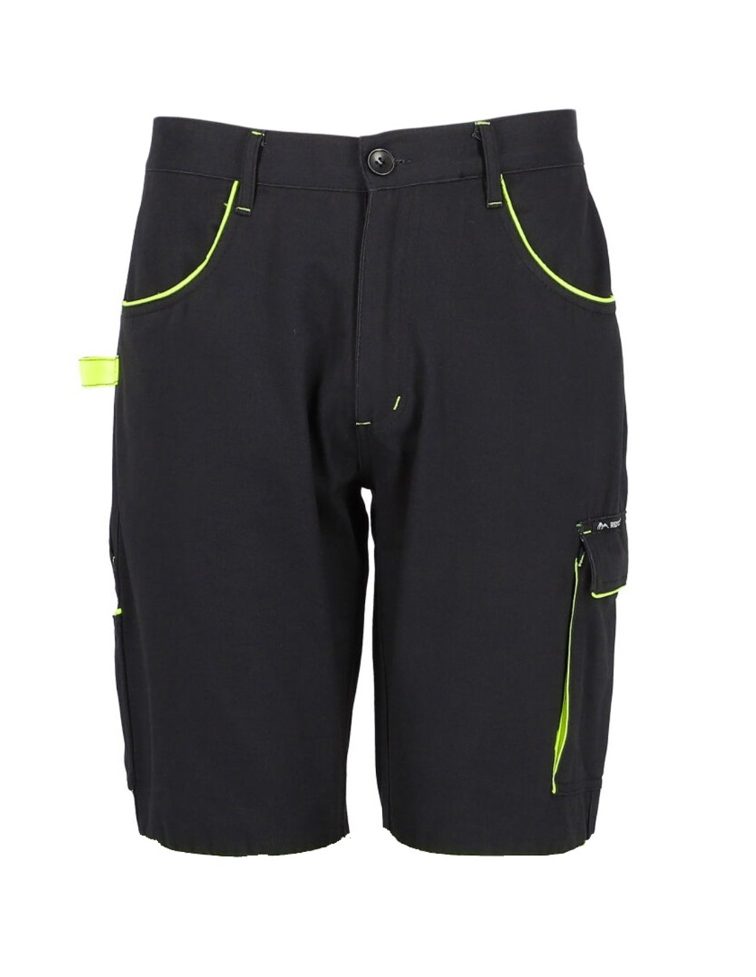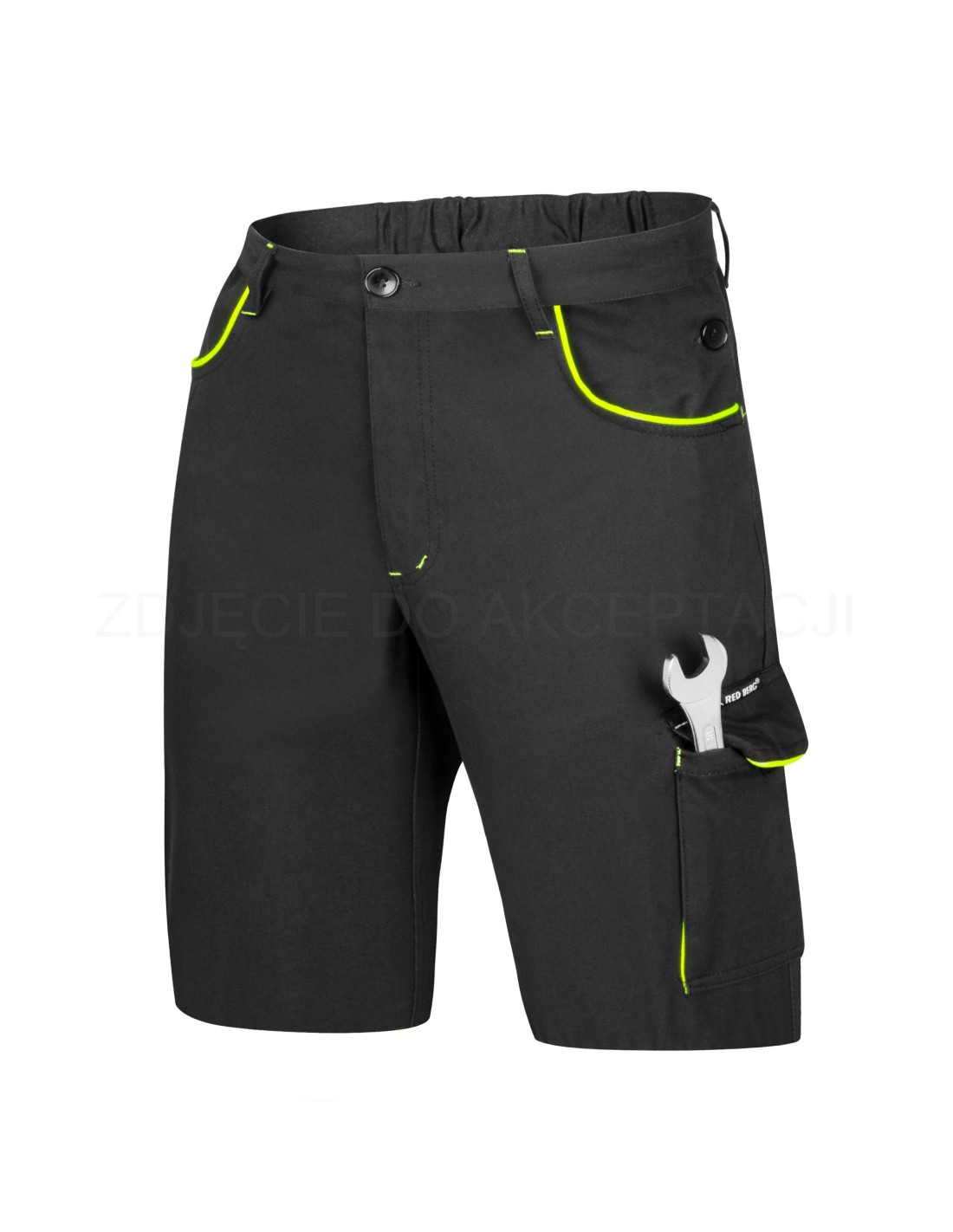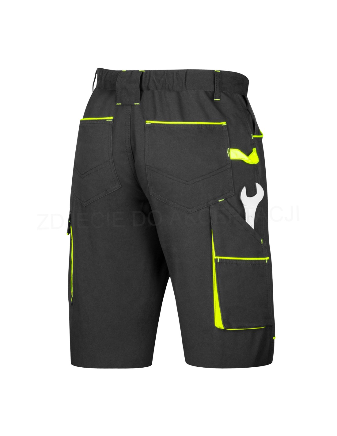 Spodnie robocze-ochronne w kolorze czarnym niebrudzącym wraz z estetycznymi żółtymi-seledynowymi wstawkami w kieszeniach przestrzennych. Rozporek na zamek błyskawiczny.