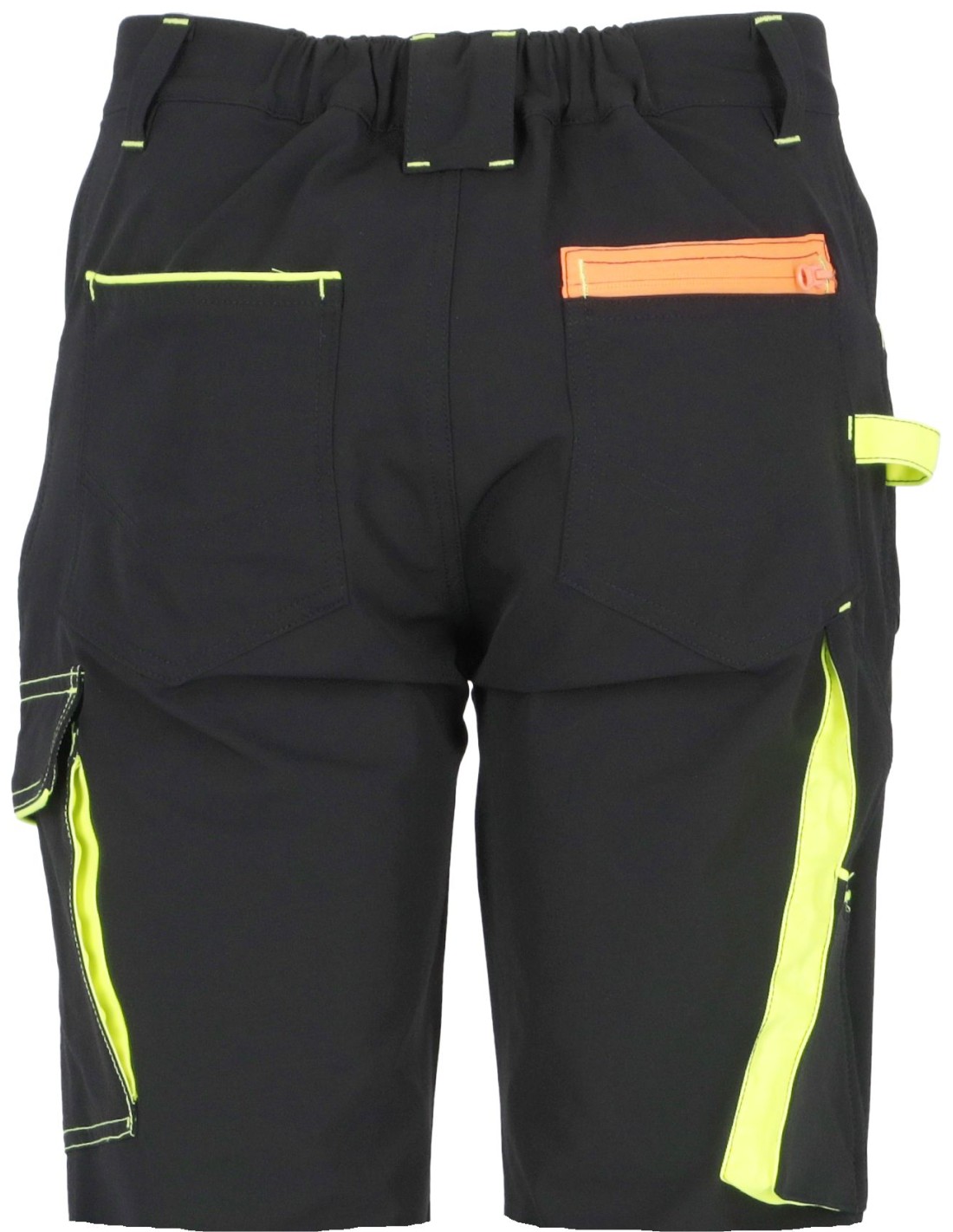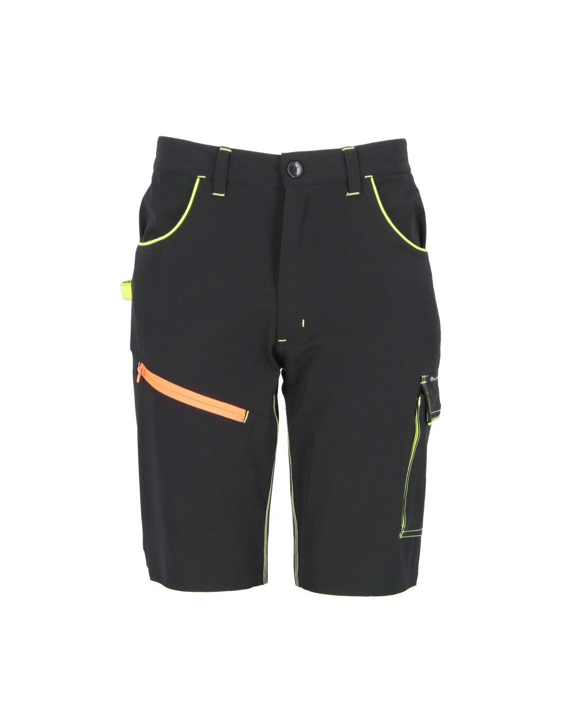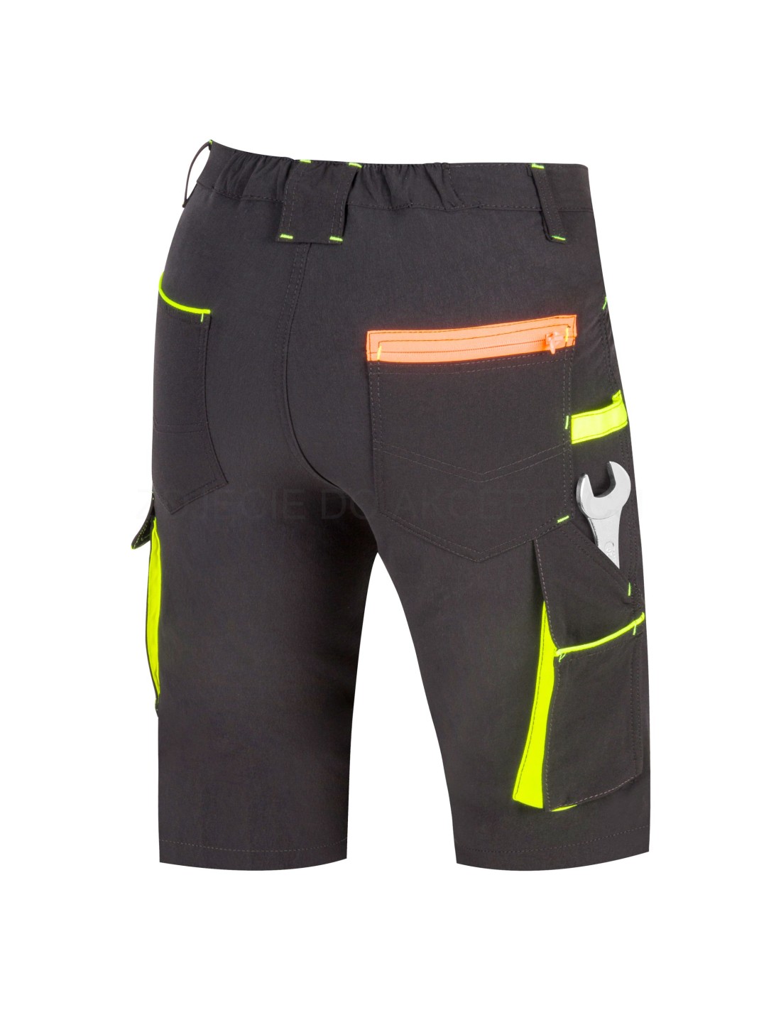 - spodenki ochronne w kolorze czarnym niebrudzącym wraz z estetycznymi pomarańczowymi i żółtymi wstawkami w kieszeniach przestrzennych